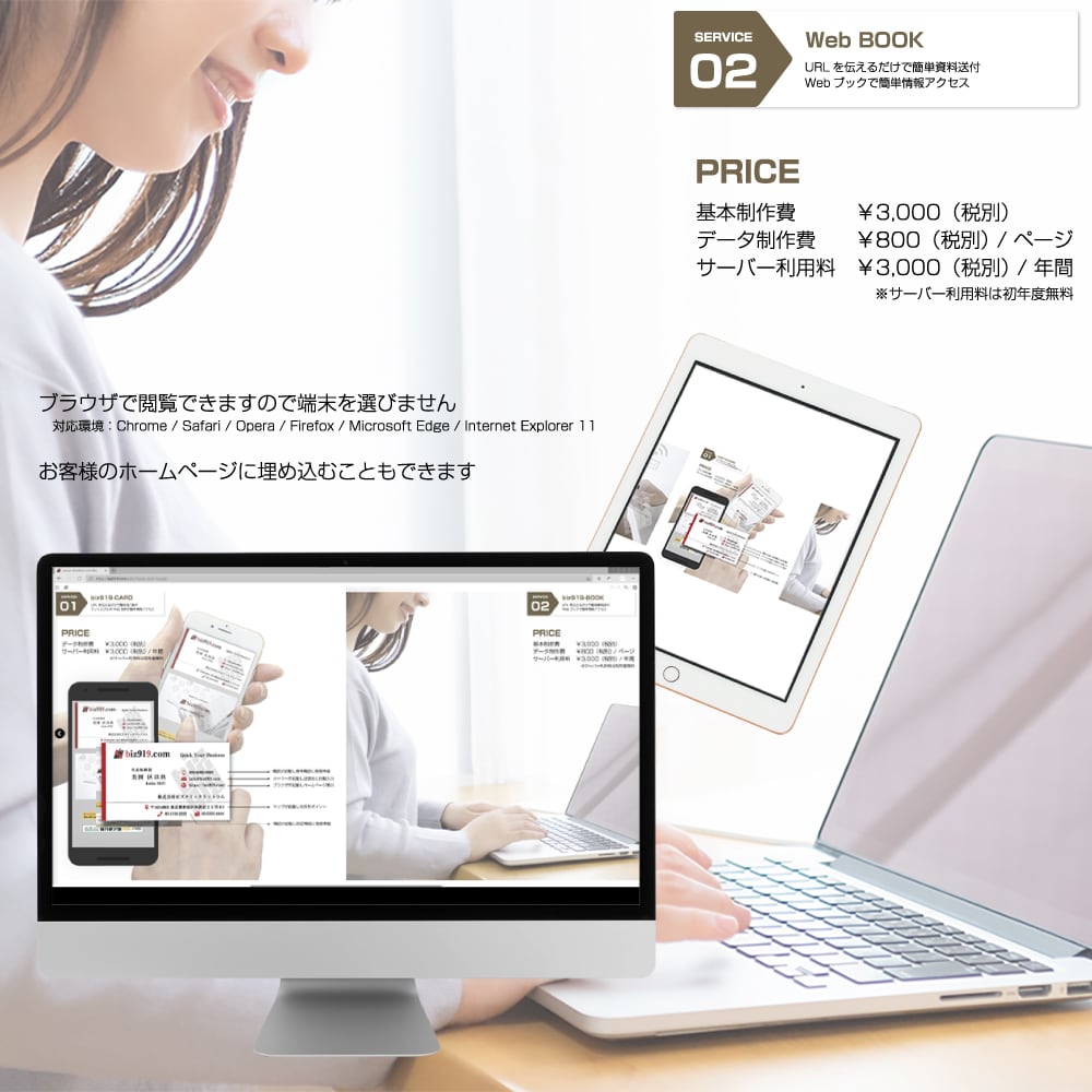 12ページ(表紙と裏表紙を含む)のWeb BOOKを制作しWeb上に掲載するサービスです。お客様の商品・サービス資料や会社案内などをWebブックにしインターネット上で閲覧していただけます。ブラウザで閲覧できますので端末を選びません。Chrome / Safari / Opera / Firefox / Microsoft Edge / Internet Explorer 11に対応しています。URLを伝えるだけで相手の方もご覧いただけます。また、お客様のホームページに埋め込むことも可能です。手元に資料がない場合などの緊急確認用データとしてもご利用いただけます。制作したBOOKデータをお客様のホームページに埋め込むことも可能です(埋め込み用のタグを準備いたします)。BOOKの元となるデータはお客様よりご提供ください(Adobe Illustrator(ai,eps)、Photoshop(psd)、Indesign(indd)、または、PDF、JPG、PNGのいずれかでお願いします。)。